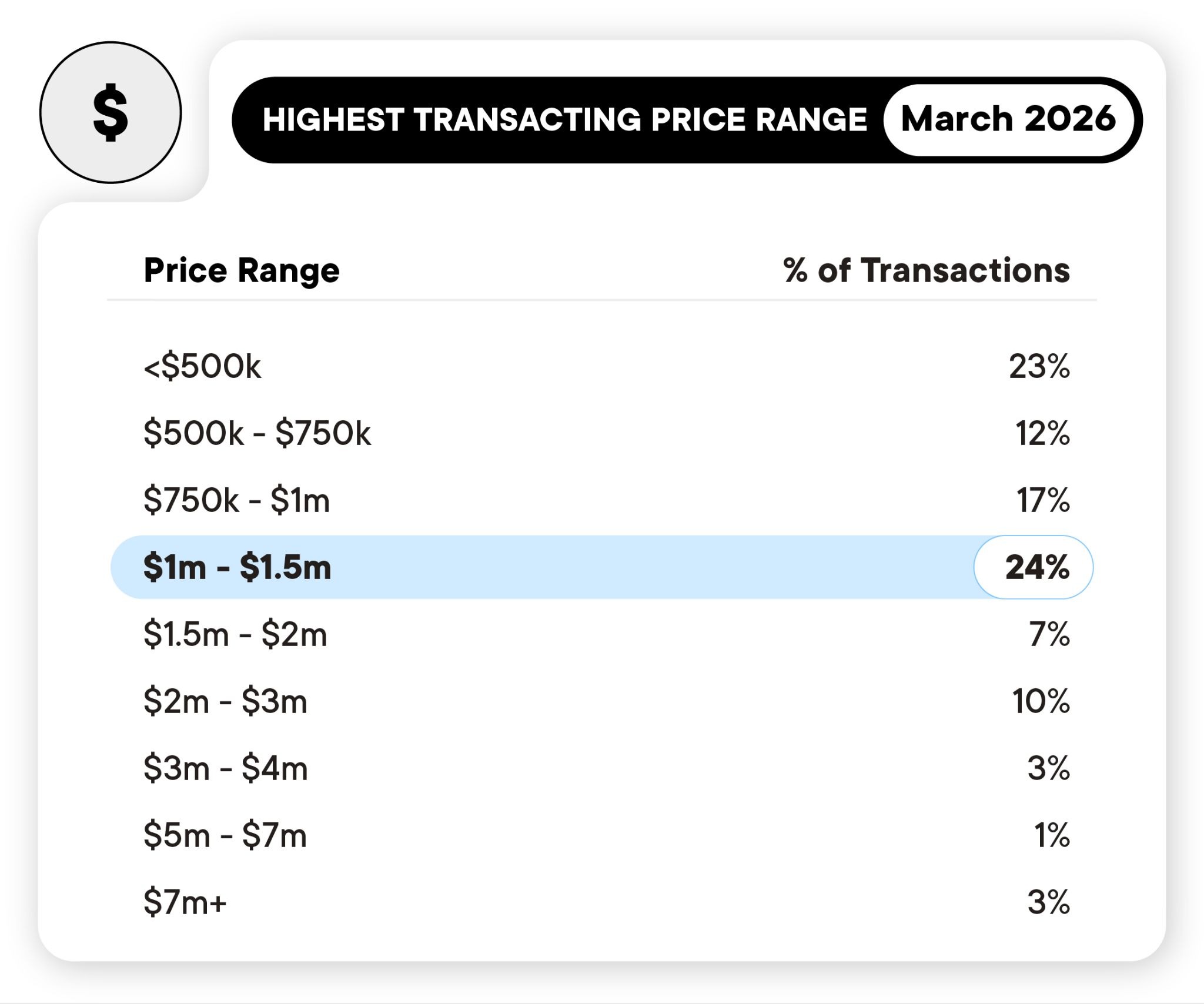 $1.5m–$2m: Made up 7% of transactions, reflecting steady but more selective demand in this range, only a 1% decrease from February.
