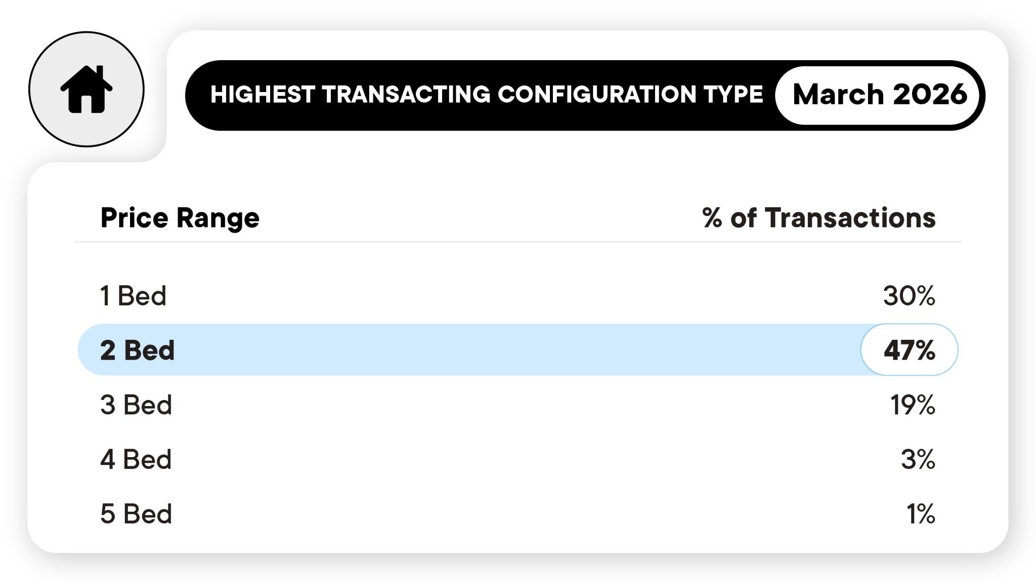 Three-bedroom dwellings captured 19% of activity, as larger configurations were less common, with four-bedroom dwellings representing 3% of transactions, and five-bedroom homes accounting for 1% of March transactions.