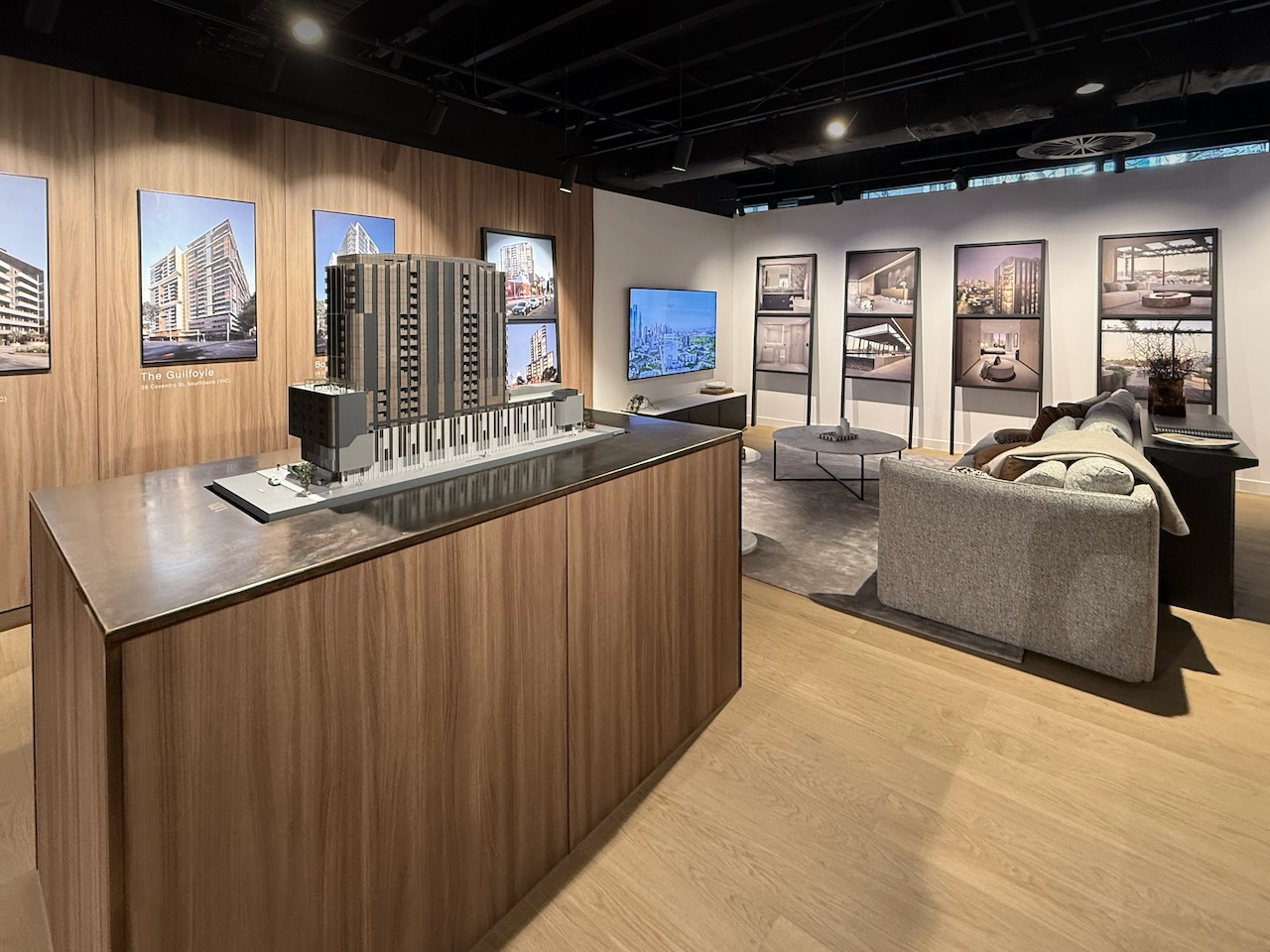 Marketing collateral - including renders, floor-plans and floor-plates - is displayed across commercial-grade screens located throughout the display, ensuring buyers can visualise the design, layout and amenity with clarity and ease.