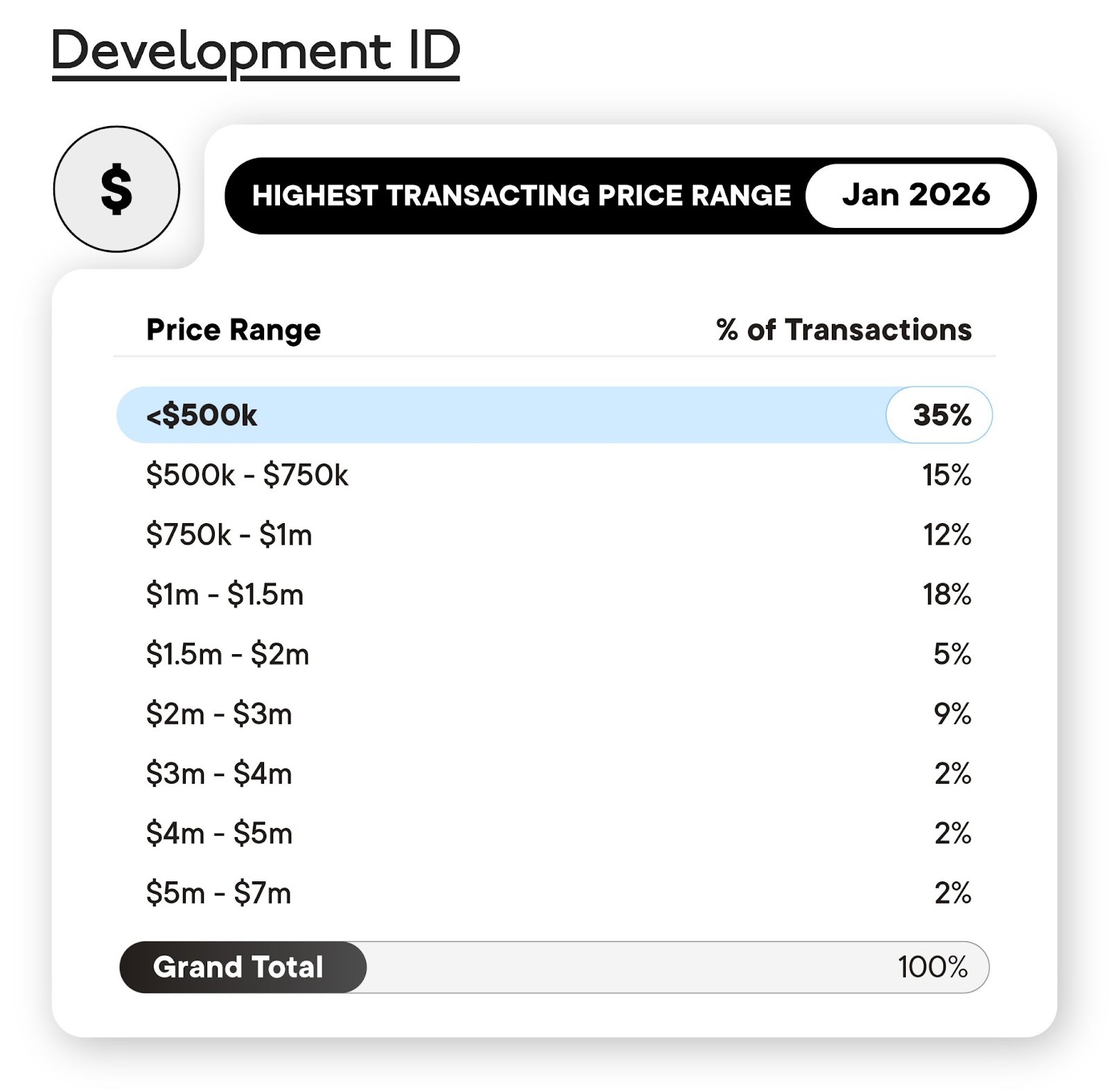 Higher-value transactions remained selective, with $1.5m-$2m accounting for 5%, steady month-on-month, and limited activity above $3m accounting for around 15%.