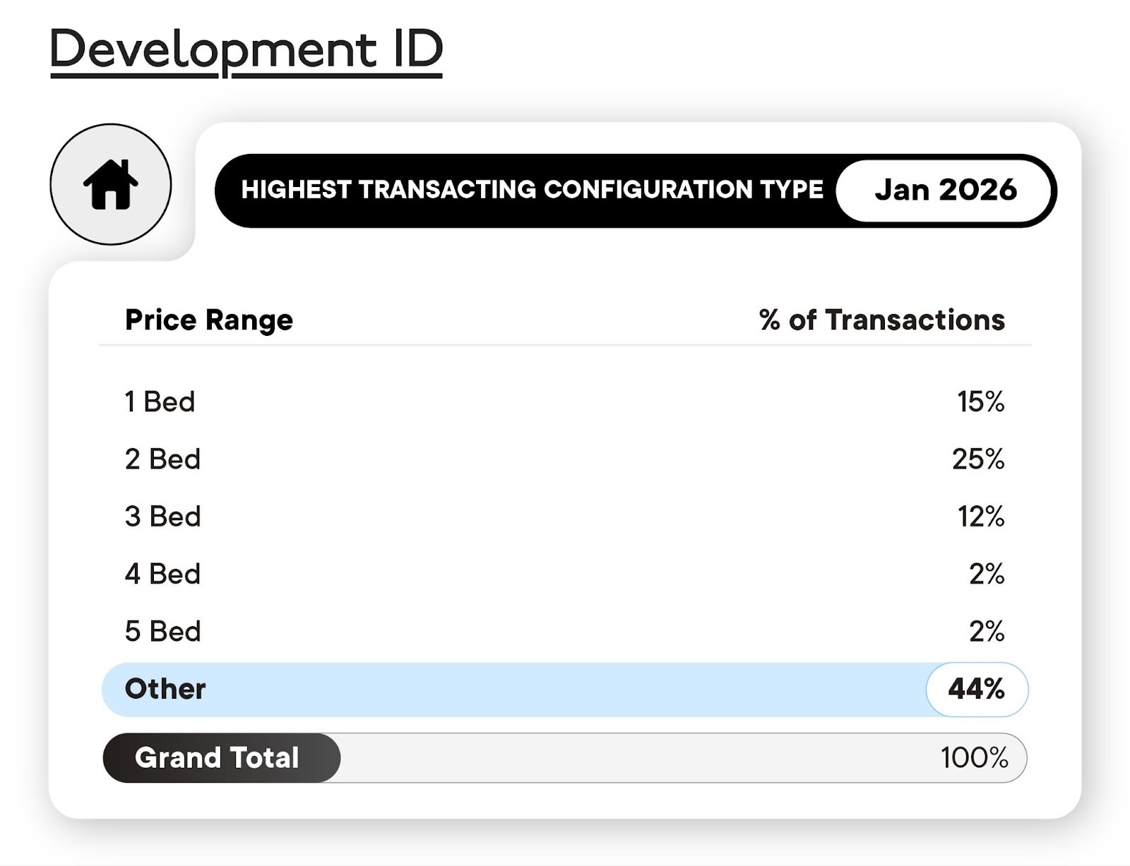 In January, two-bedroom residences were the most transacted built form configuration at 25%, with one-bedroom homes easing to 15% and three-bedroom dwellings increasing to 12%.