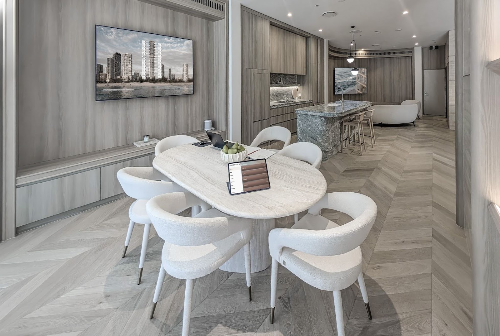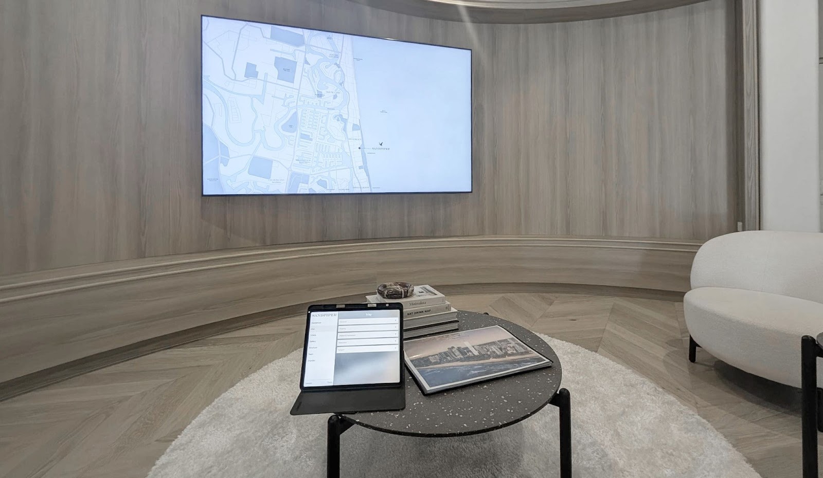 A large 98” screen holds the central focus of the space, allowing the sales team to move seamlessly between coastline context, architectural detail and key development insights in real time.