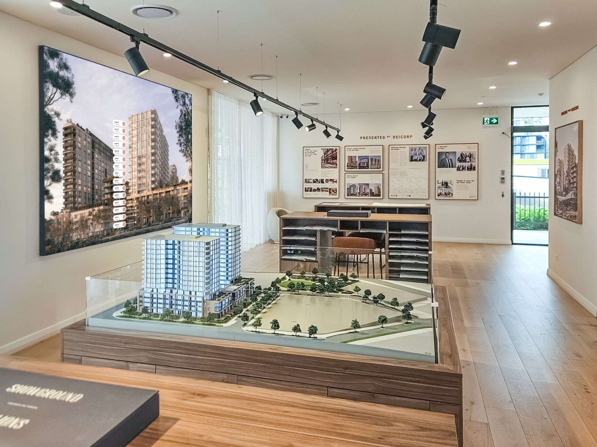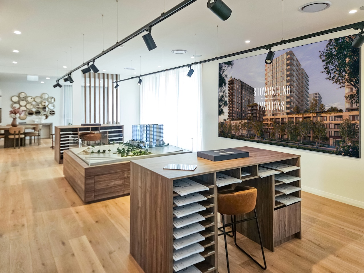 Connected to Showcase and positioned adjacent to a meeting table, it ensures every conversation between sales agents and buyers is backed by vivid, large-format visuals that bring the project's vision into immediate focus.