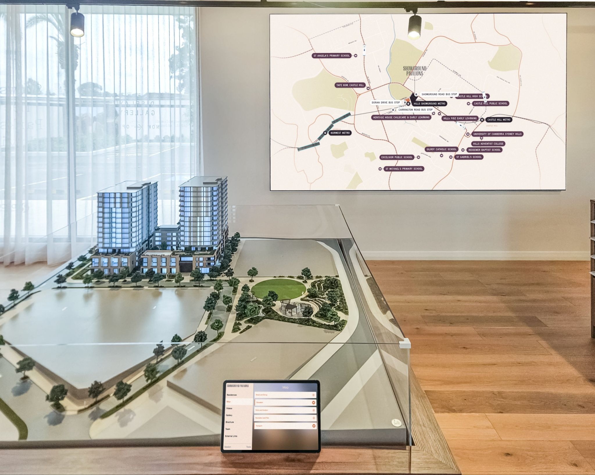 At Deicorp’s Showground Pavilions display suite in Sydney, the hardware integrated with Showcase presentation software allows for a fluid, informed dialogue between agent and buyer.